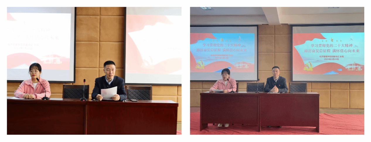 为深入学习宣传贯彻党的二十大精神,切实加强对广大学生的思想政治引领,扎实落实立德树人根本任务。322日下午,经济管理学院党委书记孙亮以“学习贯彻党的二十大精神 踔厉奋发启征程 满怀信心向未来”为题,在7603为学院百余名学生党员、学生干部和班级学生代表讲授2023年春季学期“开学第一课”,会议由经济管理学院党委委员、学工办主任高晶主持。