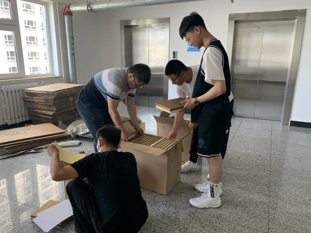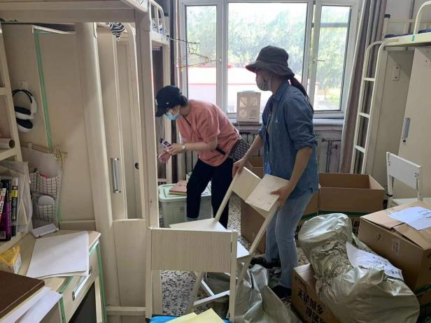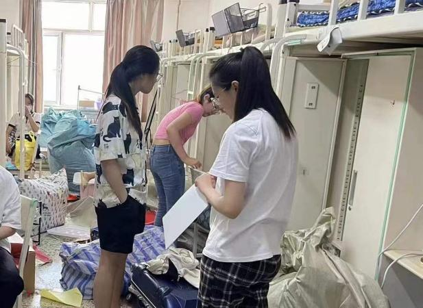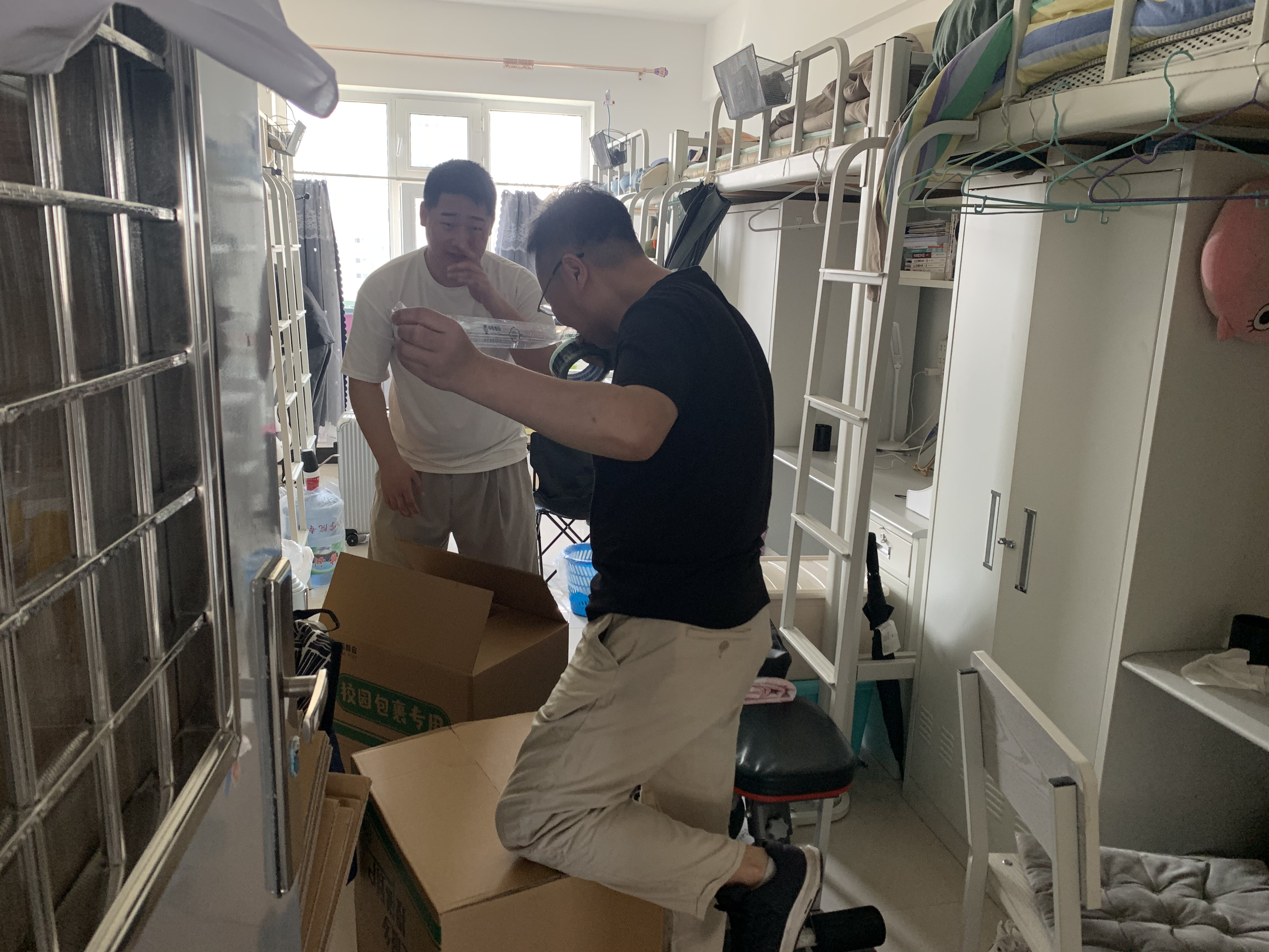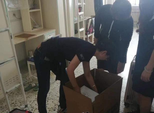 同样化身"打包员"的还有学院领导和党员教师。他们陪着志愿者们一起打包,并不断改进更实用的打包方式。先打包贵重物品,再打包普通物品,易碎物品裹在柔软衣物之中,书本单独捆包。他们仔细检查包裹、妥善规整、严密封装、标明学生信息、搬运到统一地点。打包过程中,老师们说的最多的就是:“这是你的吗?”“没事,能给你装起来的都装起来。”“这个轻点装。”“柜子最上面那个别落下。”
