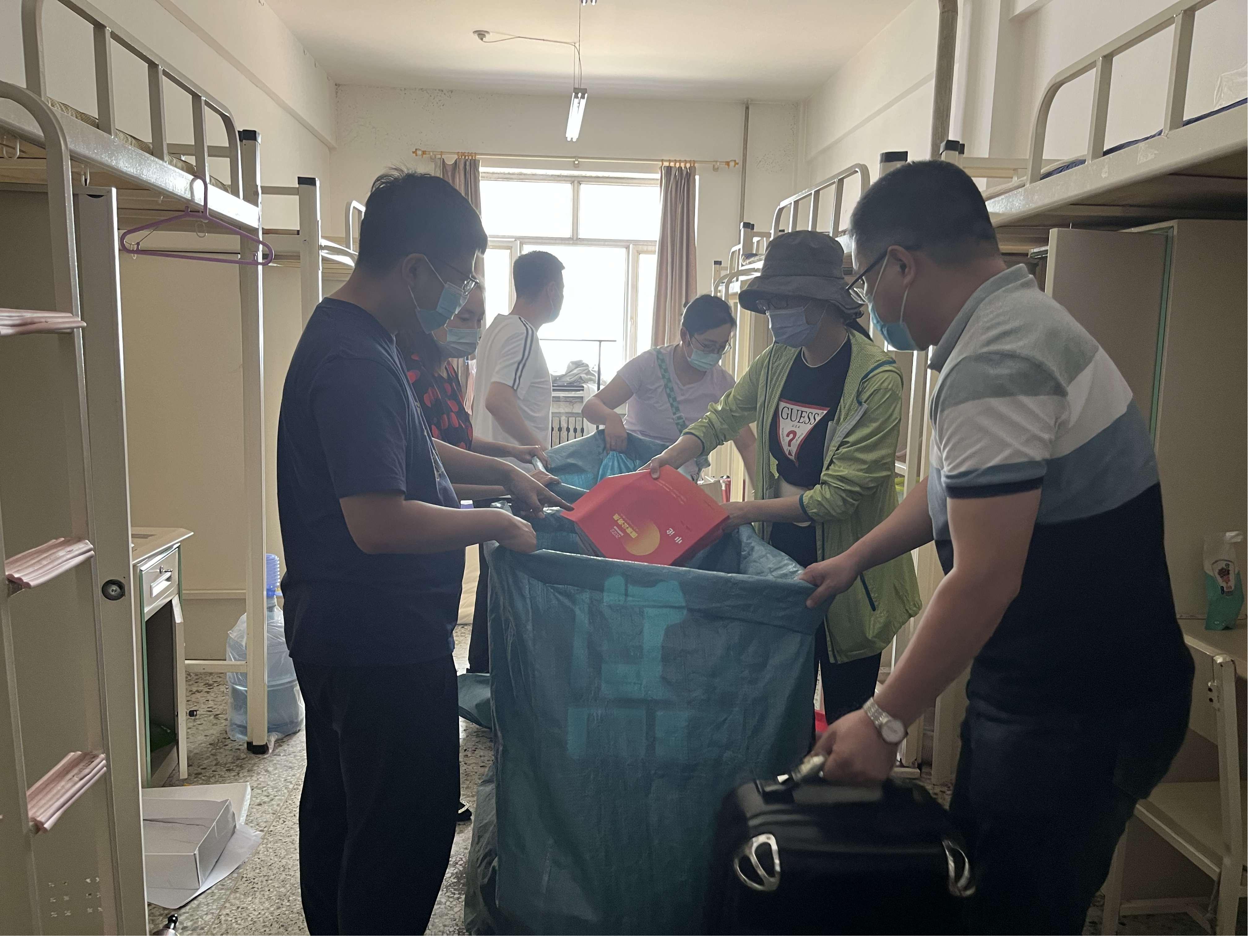 辅导员们全天坚守在寝室和行李邮寄点,大到十几斤的电脑,小到证明材料,辅导员们都耐心细致地帮助学生整理和邮寄,甚至忙碌到忘记午饭。由于天气闷热加上长时间高强度持续工作,有的辅导员出现了低血糖等身体不适;有的辅导员前几日刚扭伤胳膊,但依旧早早地赶到学校,加入打包行李的行列。他们把对学生的关爱和祝福装进行囊,用行动诠释“爱与责任”的师德内涵,为学生上好“最后一堂思政课”。