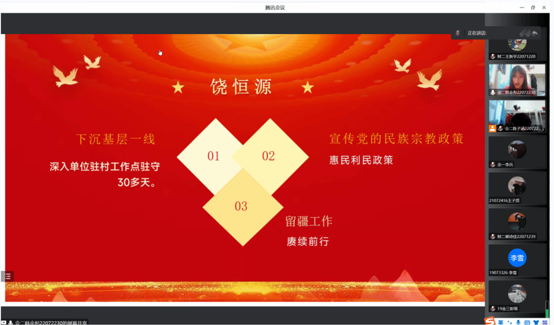 (文/高晶)为贯彻落实党的二十大精神,深入学习贯彻习近平新时代中国特色社会主义思想,引导青年学子扎根基层沃土,厚植爱党爱国情怀,鼓励我院学生到祖国最需要的地方去。5月8日,经济管理学院分团委通过线上腾讯会议的形式开展了“志愿西部行 奉献新时代”主题团会活动。本次会议由陈子涵同学主持,共120名青年代表参加会议。