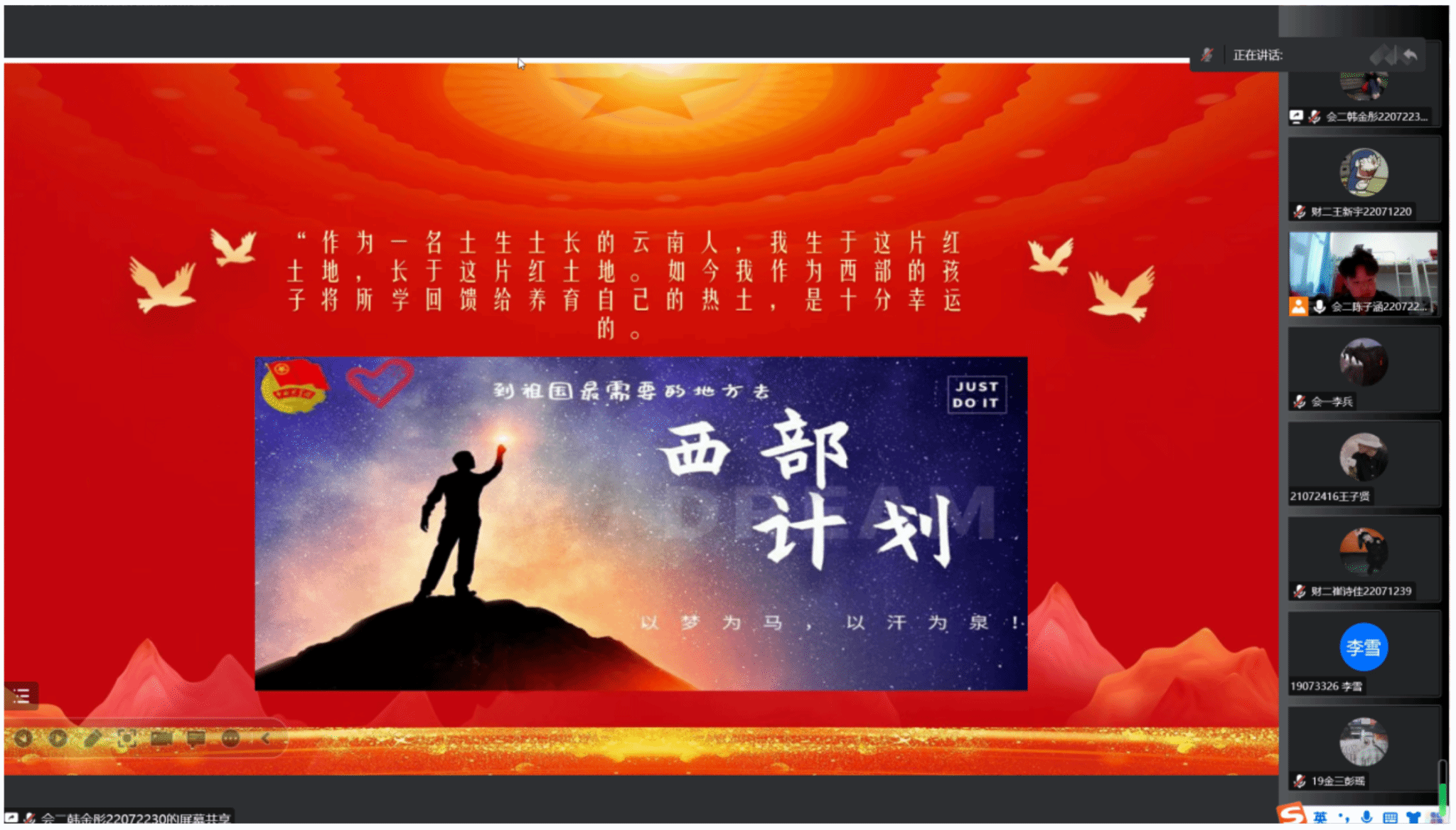 奋进新征程,志愿做先锋。此次“志愿西部行 奉献新时代”主题团会让同学们对西部计划有更加清晰、深入、全面的了解,同时激发同学们奉献西部、服务国家的热情。未来,经济管理学院分团委也将继续不忘初心,引导并鼓励更多经管学子践行并延续志愿精神,在志愿服务中绽放青春风采。