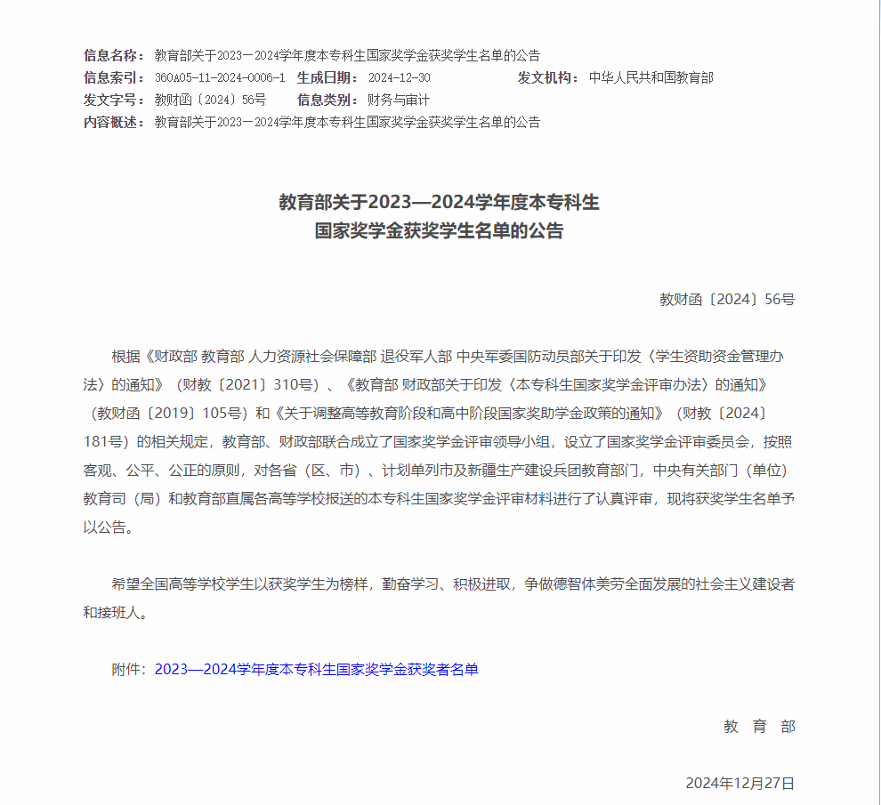 近日,教育部公布了2023-2024学年度本专科生国家奖学金获奖学生名单,经济管理学院的张雅婷、刘家利、袁佳梅三位同学榜上有名。
