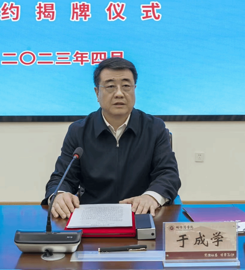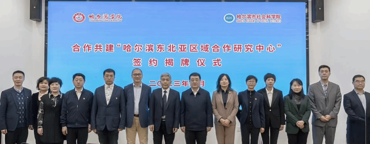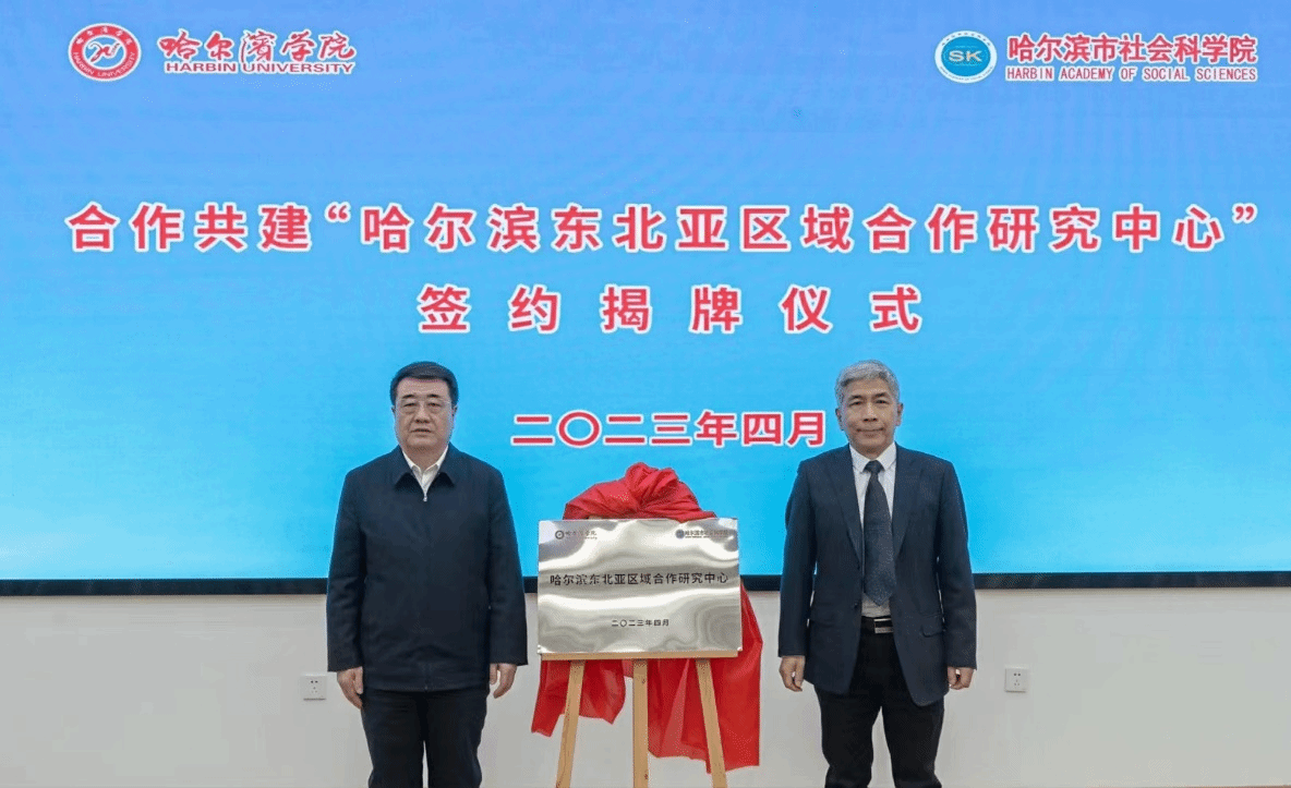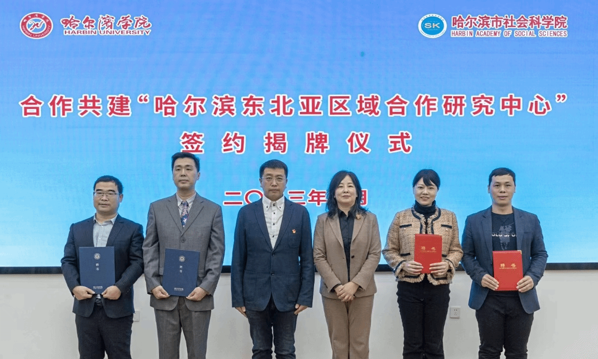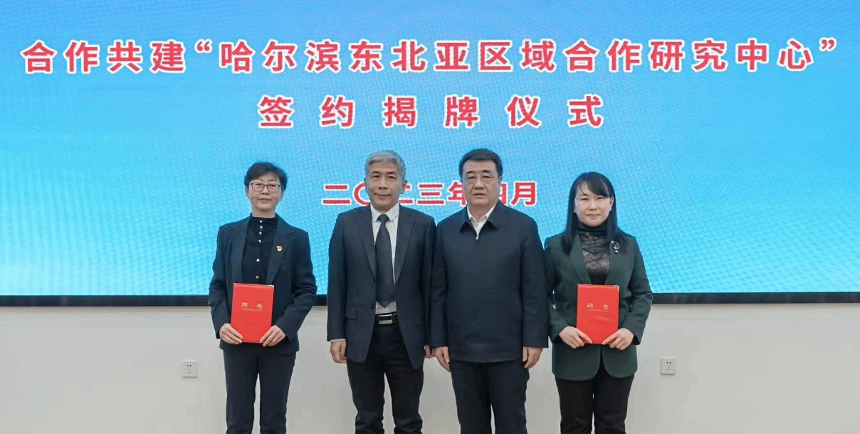 吴旭峰和刘轶梅代表双方签订了“哈尔滨东北亚区域合作研究中心”协议书。双方领导向我校经济管理学院院长许淑琴、市社科院东北亚研究所副所长张隽颁发中心主任聘书,向邸春光、于占成、陈曦、许永继四位客座教授、特约研究员代表颁发聘书。于成学与陈烨共同为“哈尔滨东北亚区域合作研究中心”揭牌。
