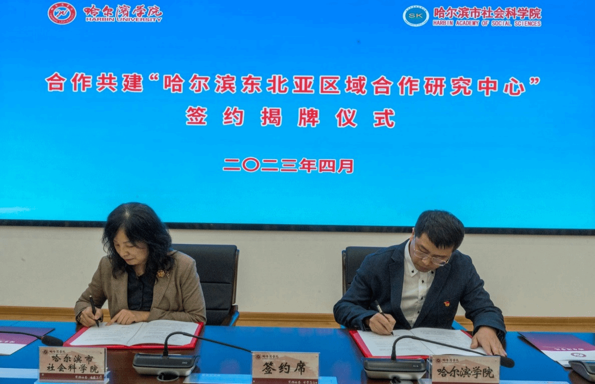 (文/程宇)4月20日上午,学校与哈尔滨市社会科学院合作共建“哈尔滨东北亚区域合作研究中心”签约揭牌仪式在党政办公楼四楼大会议室举行。哈尔滨市社会科学院党组书记陈烨、副院长刘轶梅、科研处副处长刘燕、东北亚研究所副所长张隽,MK体育校长、党委副书记于成学,副校长吴旭峰出席签约揭牌仪式。仪式由副校长宋国利主持。