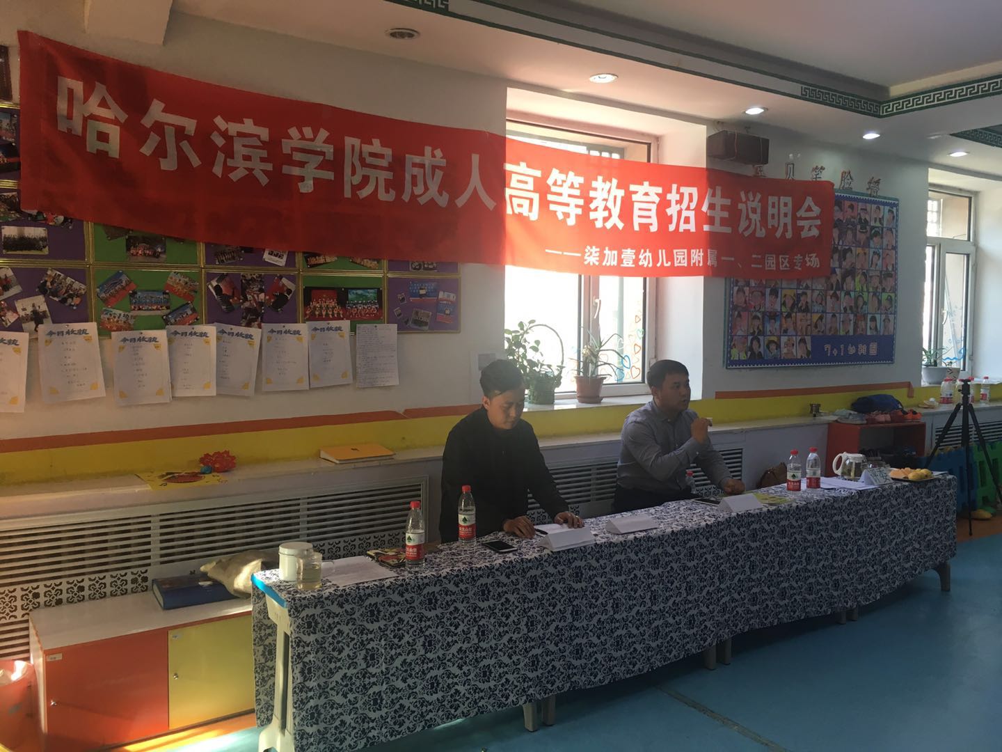 为进一步拓宽招生渠道,满足基层幼儿园教师提升学历的需求,2017年9月24日,继续教育中心(学院)利用周末时间到哈尔滨市柒加壹幼儿园附属一、二园区开展成人高等教育招生咨询。