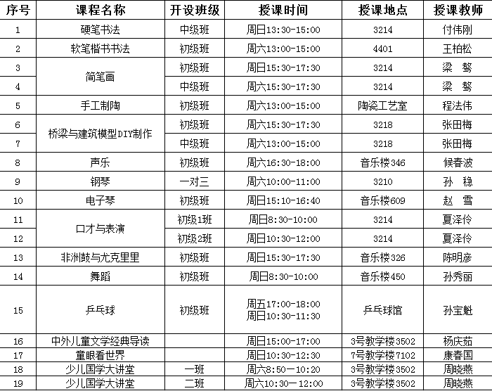 2018年春季学期少儿班课程表