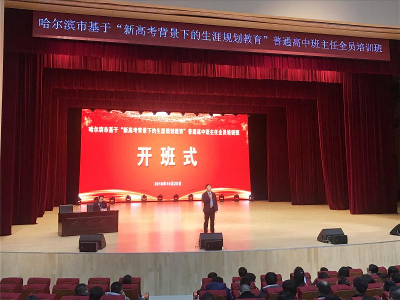 10月28日上午8:30分,哈尔滨市基于“新高考背景下的生涯规划教育”高中班主任全员培训在我校音乐厅正式开班。市教育局副局长赵文祥、市教育研究院副院长阚振林、市教育局师训处处长孟辉、市教育研究院德育部主任由沙丘、校继续教育学院院长吴立刚及我市所辖九县、市的全体高中班主任出席和参加了开班式。