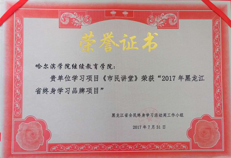 由省教育厅主办的,以“推进终身学习,喜迎十九大;发展老年教育,建设学习型社会”为主题的黑龙江省第三届“全民终身学习活动周”中,经过评选,我校继续教育学院的《市民讲堂》被评为黑龙江省“终身学习品牌项目”。