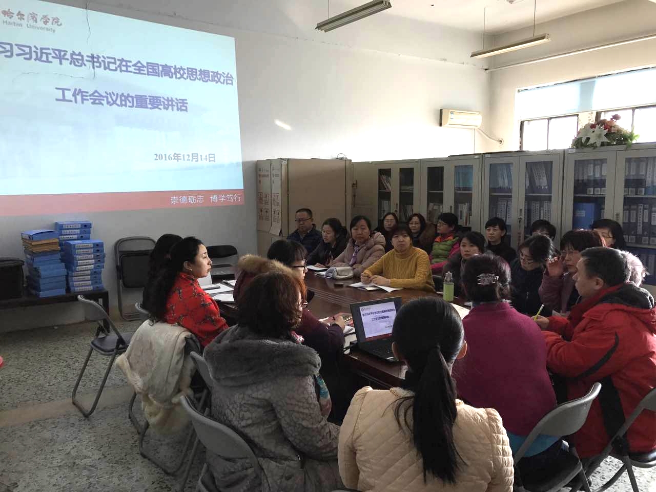 首先,由学院党总支书记姜秀英概括性地介绍了习总书记在此次会议上的讲话精神。她从“为何重视高等教育”、“为谁培养人才”、“如何培养人才”、“如何做好高校思想政治工作”、“如何办好高等教育”等五个方面解读了习总书记关于高校思想政治工作的新思路,并结合学生思想政治工作和思想政治理论课教学工作实际,谈了对此次会议精神的认识,进而对与会教师尤其是教师党员提出了进一步深化学习的要求。