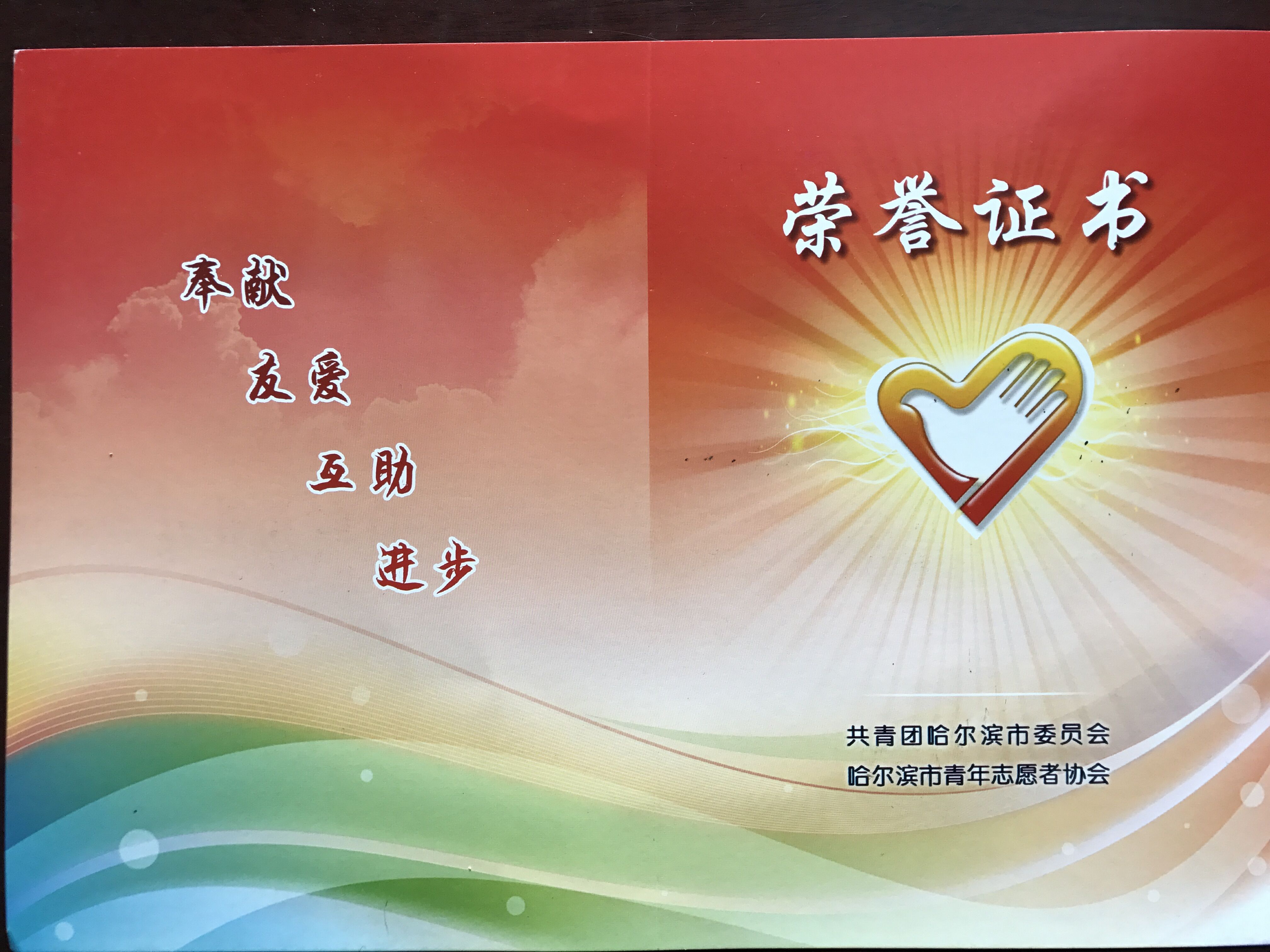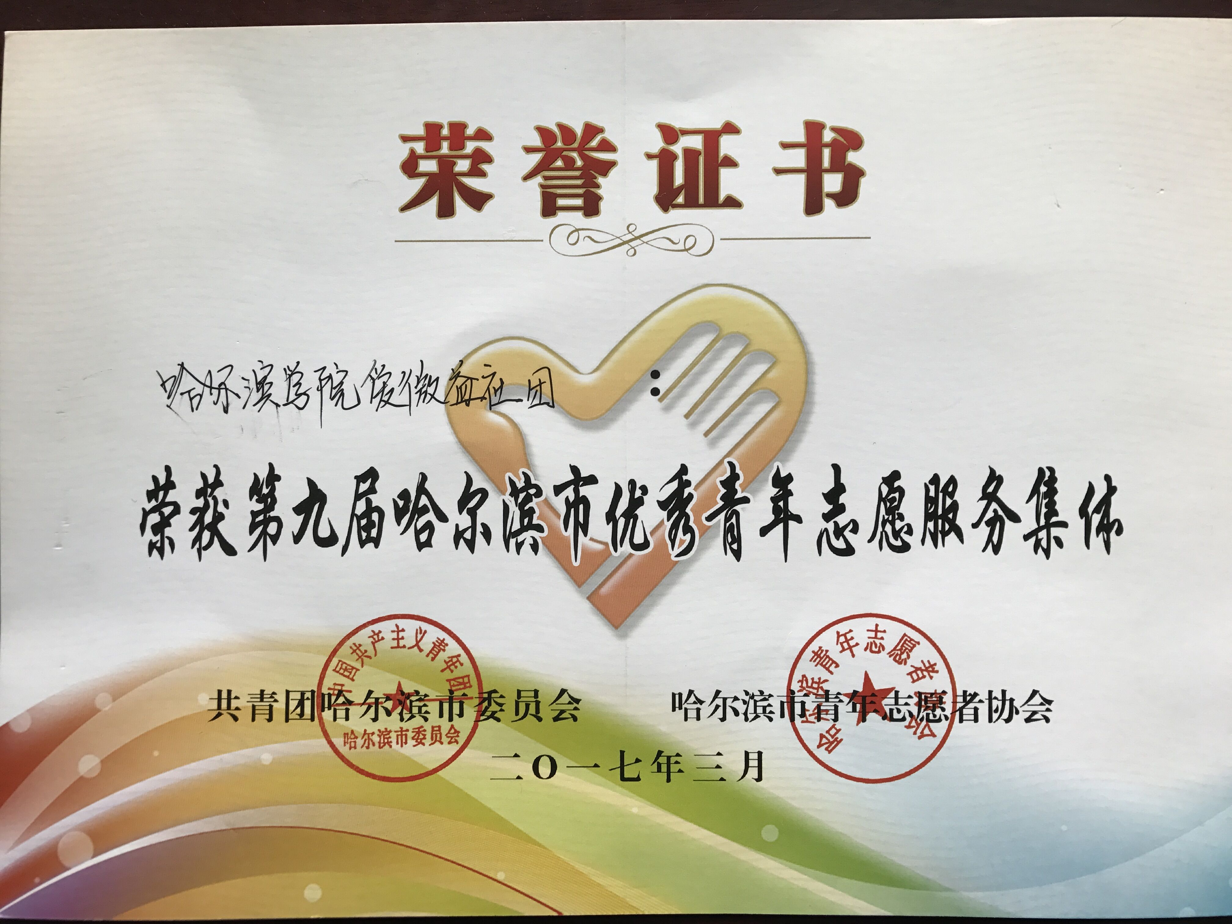 我院爱微益社团于2017年3月荣获得由共青团哈尔滨市委员会和哈尔滨市青年志愿者协会颁发的“第九届哈尔滨市优秀青年志愿服务集体”称号,特此祝贺!