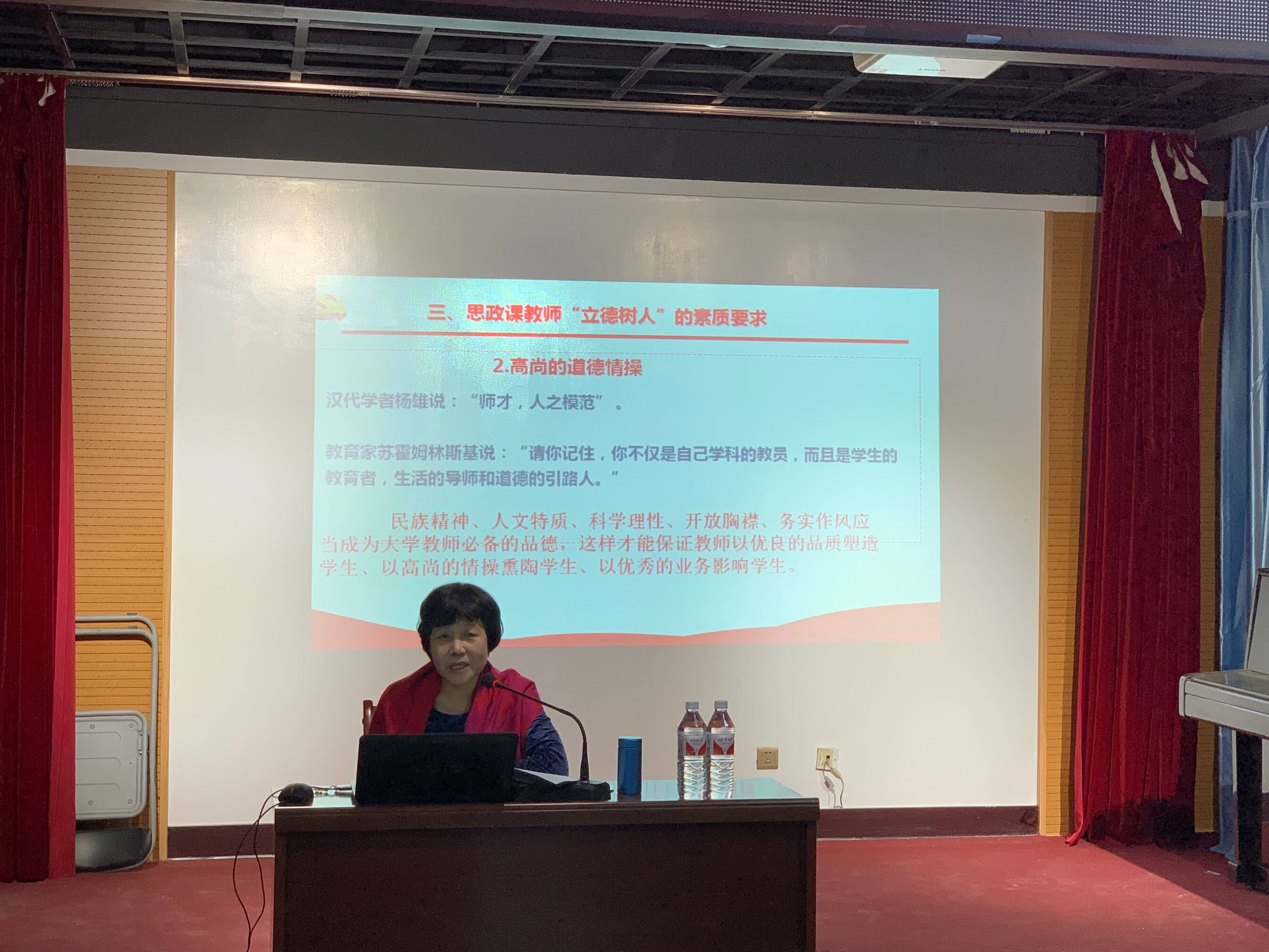讲座主要围绕立德树人根本任务的提出、落实立德树人根本任务的有效路径、思政课教师的基本素质要求等方面展开。王教授和与会教师们共同回顾了习总书记在今年全国教育大会上的讲话,明确了高校立德树人的根本任务,明确了“教育必须把培养社会主义建设者和接班人作为根本任务”,以及培养人要在六个方面“下功夫”等具体要求。王教授从东北林业大学马克思主义学院建设经验出发,为我校马克思主义学院建设和马克思主义理论学科建设提出了有益的建议,引导我们立足学校和学院实际,在科研上有成就,在学科点上有突破。王教授还分享了她对高校思政课教师应具备素质的理解,认为应具备坚定的理想信念、高尚的道德情操、深厚的学术功底和高超的教育艺术,她从个人多年进行学术研究和教育教学的经验出发,为我院教师做好马克思主义理论研究和思政课教改教研提出了许多有益的指导。
