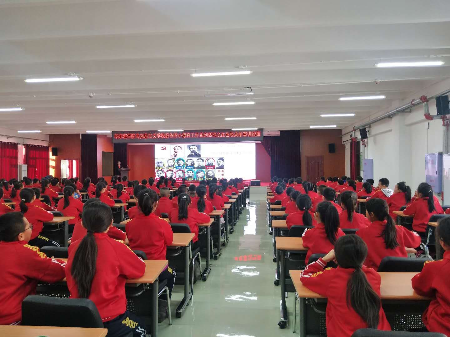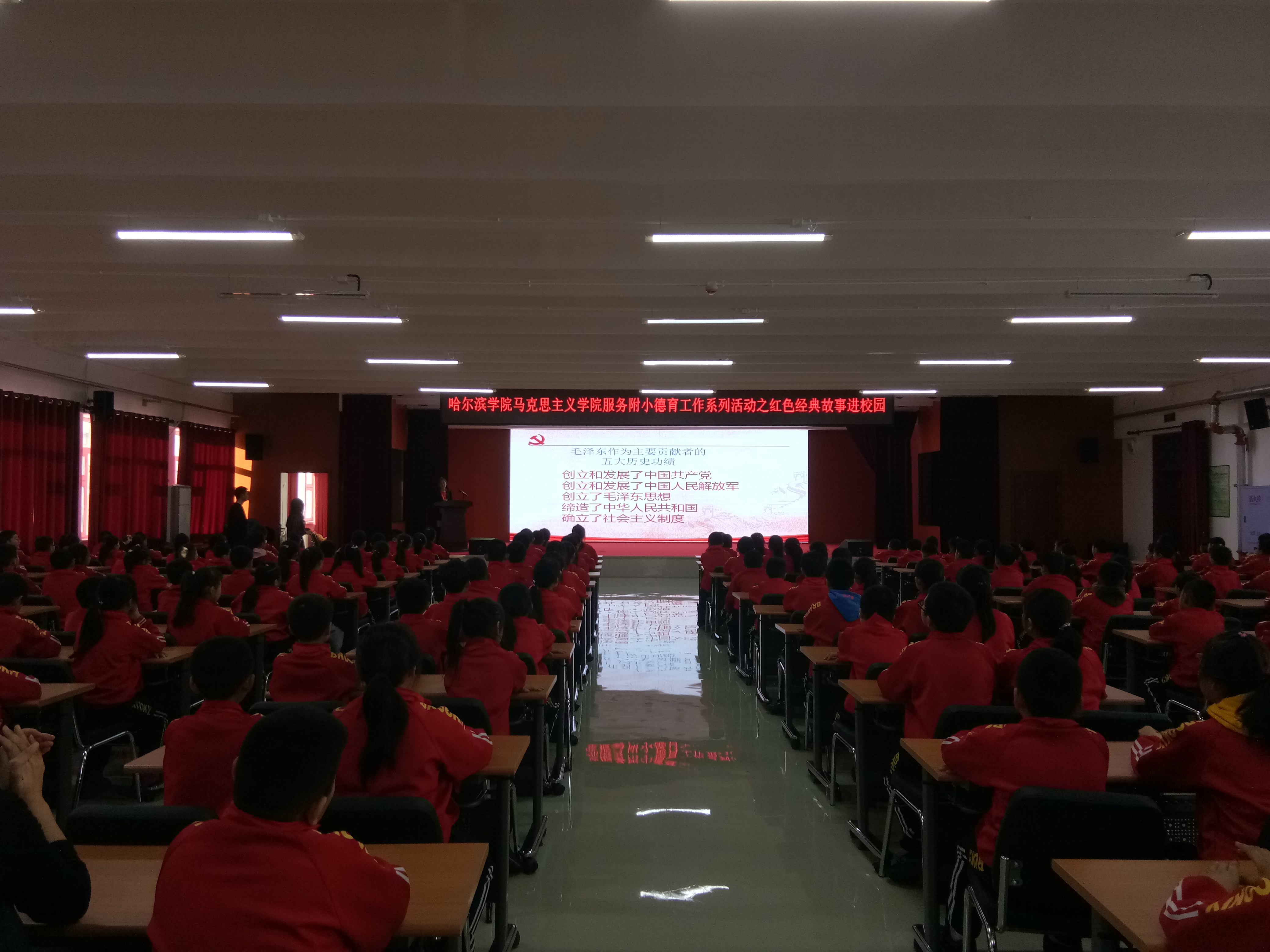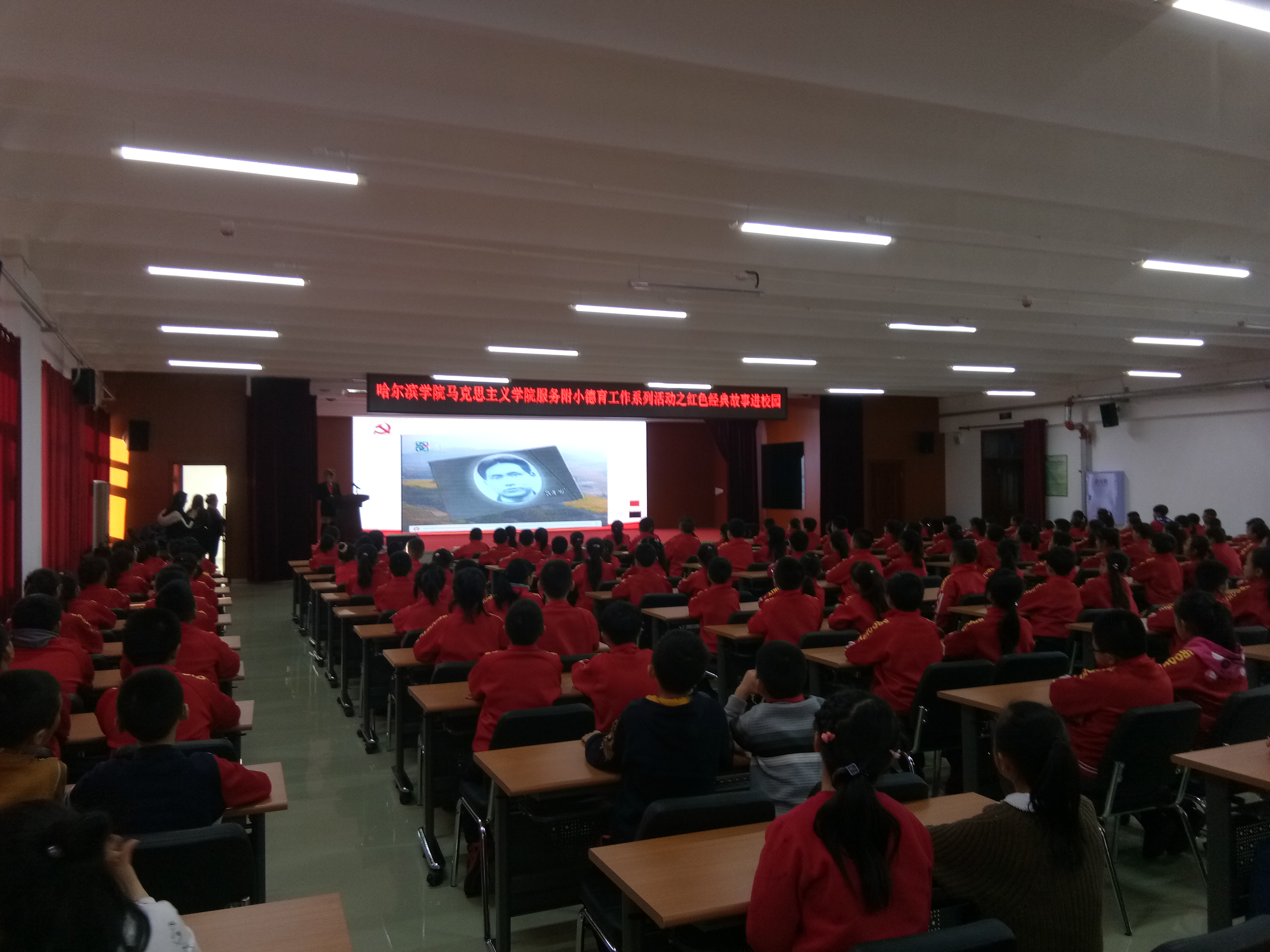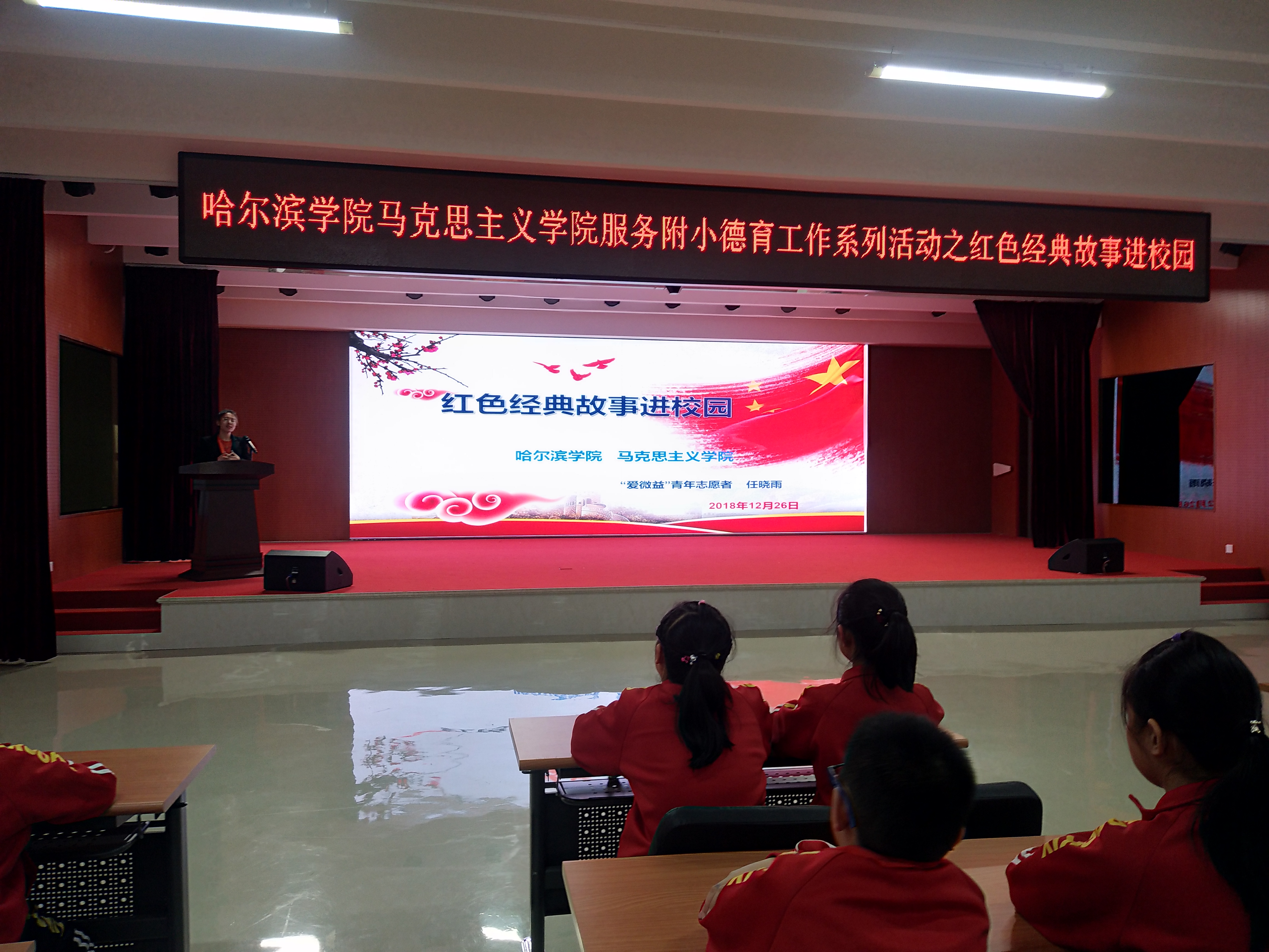 “红色经典故事进校园”是马克思主义学院力求打造的一个大学生思想政治教育品牌项目。它一方面通过大学生大量阅读专业书籍,选择讲课专题,活跃学习氛围,达到加强马克思主义学院的学风建设、加强对大学生进行思想政治教育、弘扬“奉献、友爱、互助、进步”志愿服务精神,助力大学生坚定文化自信的目的;另一方面,思政专业学生将学习成果应用到辅导小学生了解中国革命历史、传承革命文化及红色基因的教育实践中,助力于哈尔滨学院附属小学德育实践活动的有效开展。