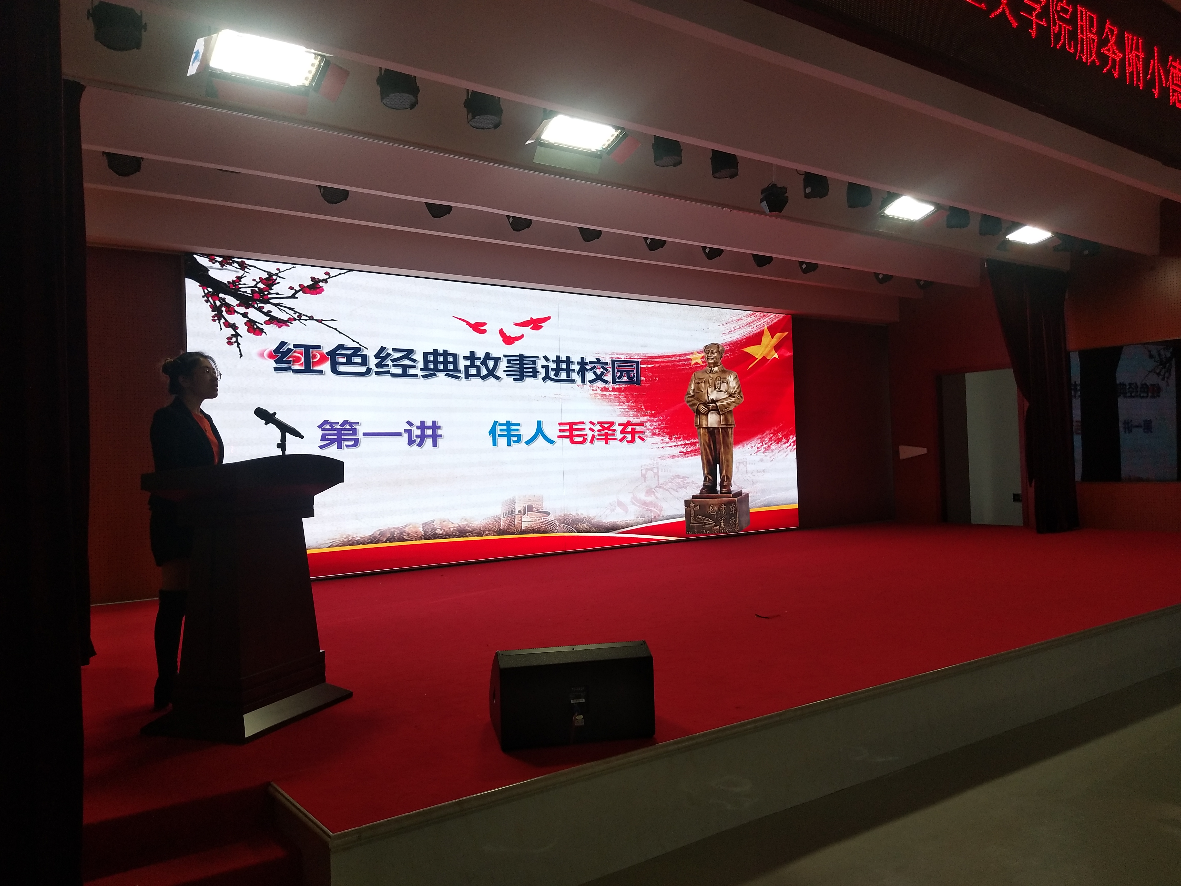 此次活动由15级同学任晓雨主讲。12月26日是毛泽东同志诞辰125周年,任晓雨同学以“伟人毛泽东”为题,以社会主义核心价值观为引领,以培养担当民族复兴大任的时代新人为出发点,根据小学生的成长特点,立足实际,结合党史、国史、爱国主义等核心内容,带领同学们一起走近毛泽东,深入而全面的了解毛泽东的历史功绩,积极引导广大学生传承革命文化、弘扬社会主义先进文化,进一步坚定中国特色社会主义文化自信。