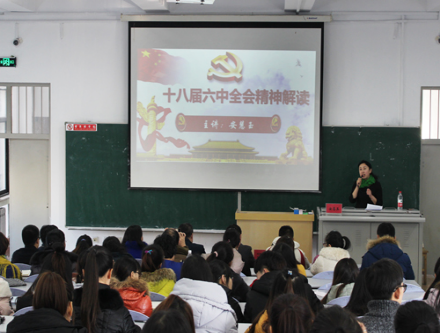 马克思主义学院安慧玉副教授受邀为教育科学学院、外国语学院、地理与旅游学院全体党员,作《十八届六中全会精神解读》专题报告。安慧玉副教授首先对比分析了历届六中全会的核心议题,阐释了六中全会精神的重要意义,在此基础上,分析了六中全会精神提出的国际和国内背景,最后,针对十八届六中全会精神做了深入细致的解读。报告史论结合、逻辑严谨、事例详实、图文并茂,紧密结合实际,内容丰富、思想深刻,使与会党员充分认识到全会召开的重要意义,牢固树立“一个核心”和“四个意识”,努力自觉坚定理想信念,做共产主义的坚定信仰者和中国特色社会主义的合格建设者。