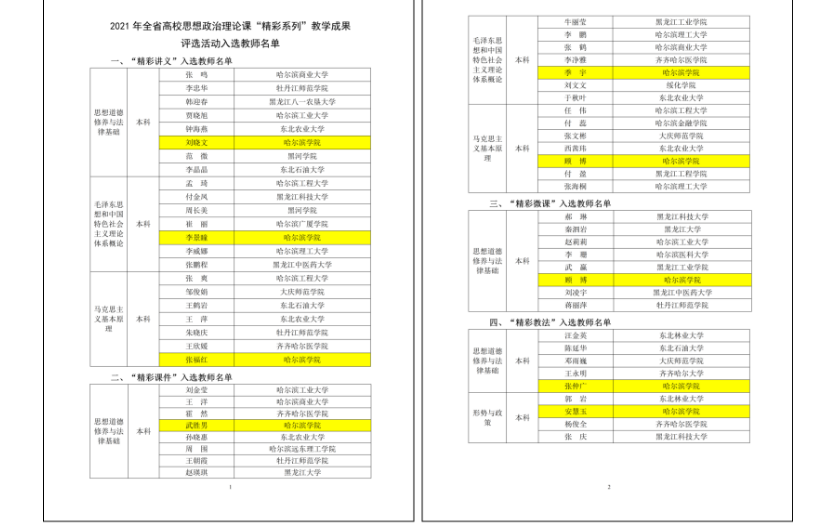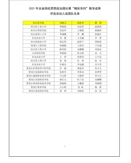 日前,黑龙江省教育厅举办的2021年全省高校思想政治理论课“精彩系列”教学成果评选结果正式公布。马院共有9项个人作品和1项团队作品入选,取得了历史空前的好成绩,获奖总数居于全省高校前列,充分展示了我院思政教师的水平与风采,为学校争得了荣誉。