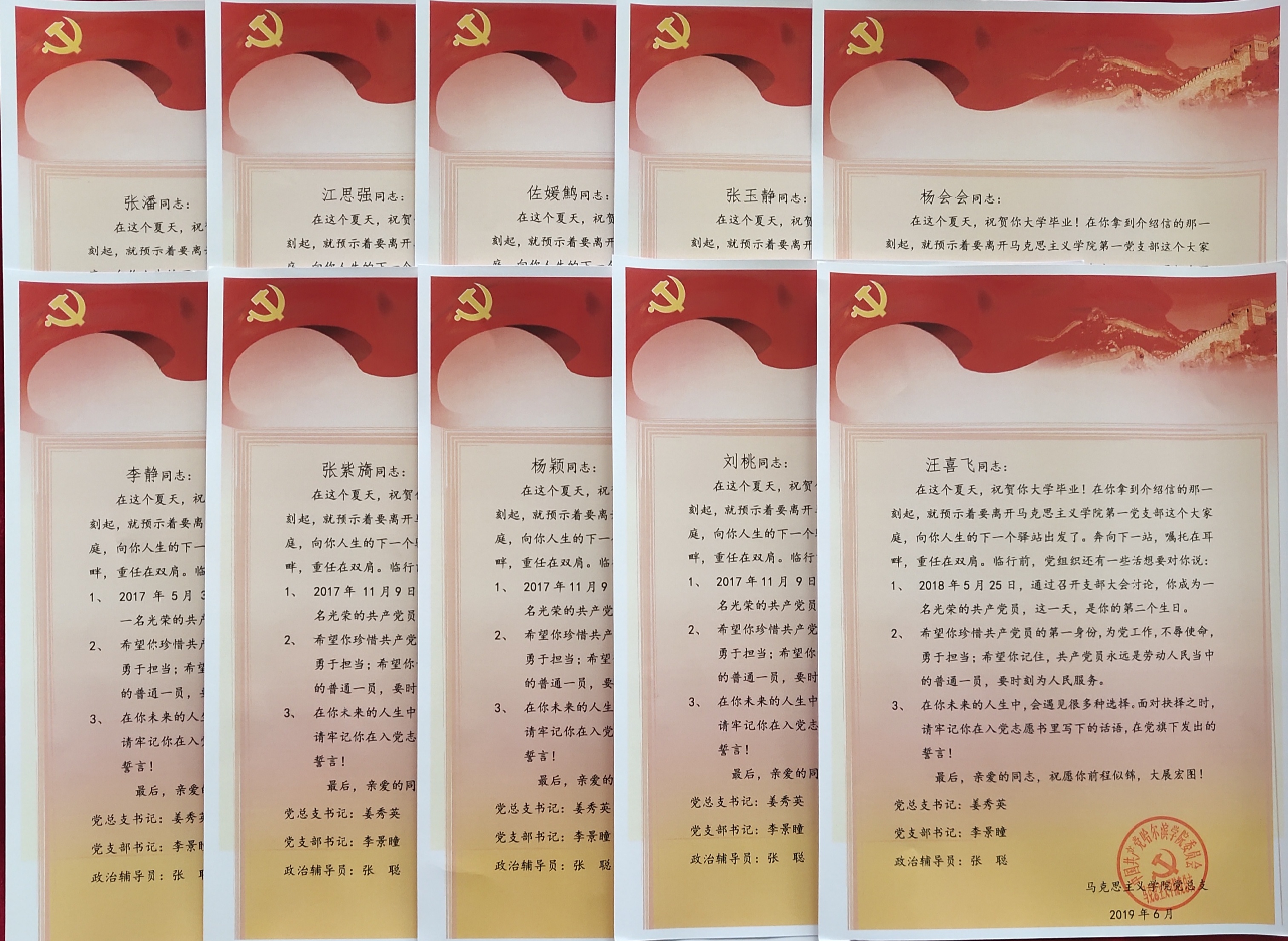 临别在即,诸多嘱托。马克思主义学院第一党支部支委会精心设计制作了“致毕业生党员的一封信”,党支部书记还自费赠送了刻有学校名字、学院院徽和毕业生党员名字的小礼物,希望毕业生党员同志能回首来时路,不忘初心,牢记使命。