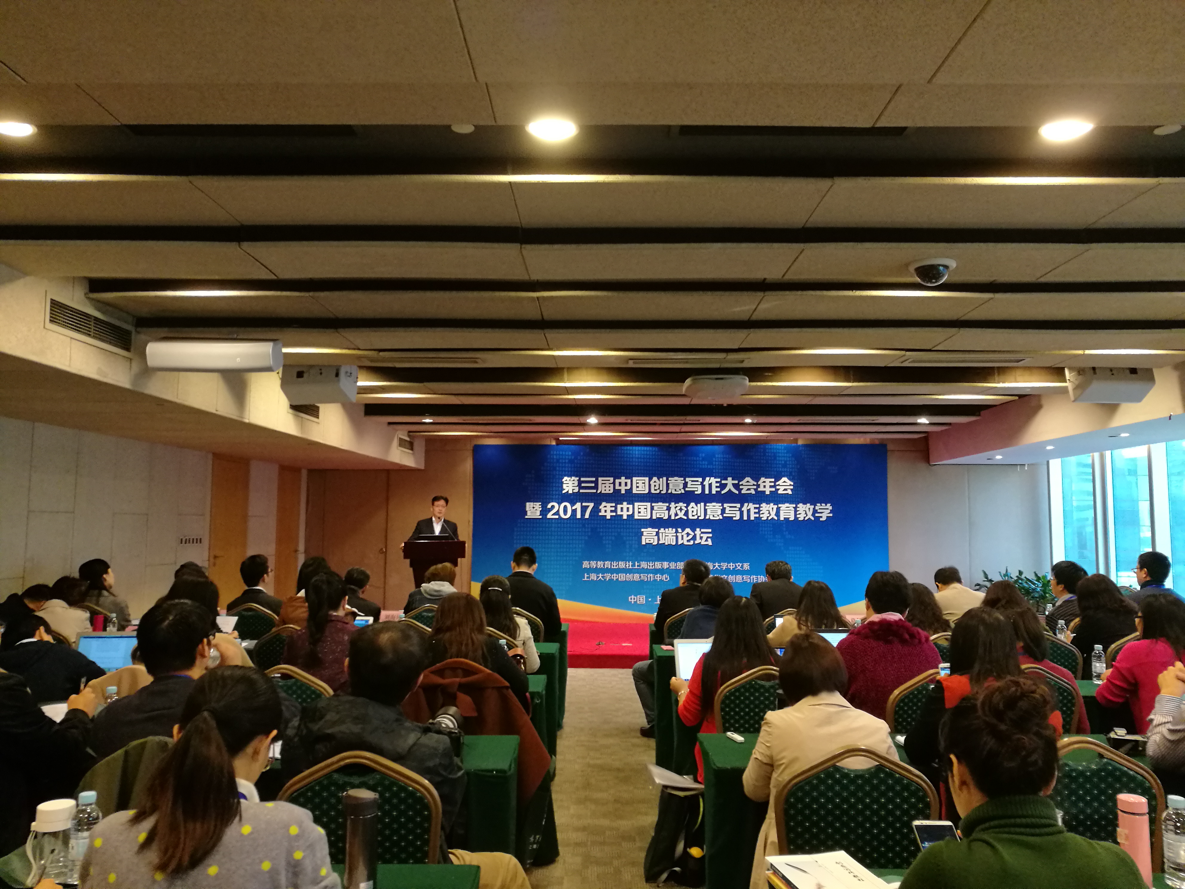 11月12日和13日,我院创意写作课程主讲教师刘自匪教授,赴上海参加了第三届中国创意写作大会年会暨2017年中国高校创意写作教育教学高端论坛。会议由高等教育出版社上海出版事业部、上海大学中国创意写作中心主办,上海大学中文系、世界华文创意写作协会协办。与会的主要专家学者有:上海大学中国创意写作中心主任葛红兵教授、复旦大学创意写作专业负责人王宏图教授、中国写作学会副会长岭南师范学院刘海涛教授、上海大学中国创意写作中心副主任许道军副教授、《雨花》杂志常务副主编江苏师范大学中文系叶炜副教授等。媒体代表有:高等教育出版社副社长陈建华,阅文集团内容总监杨沾等。来自全国各高校写作和创意写作专业及学科的专业教师和在沪部分高校相关专业的博士生、研究生等共200多人参加了会议,大会盛况空前,气氛热烈,标志着中国创意写作事业如海月初升、洪波涌起,气象蔚然。