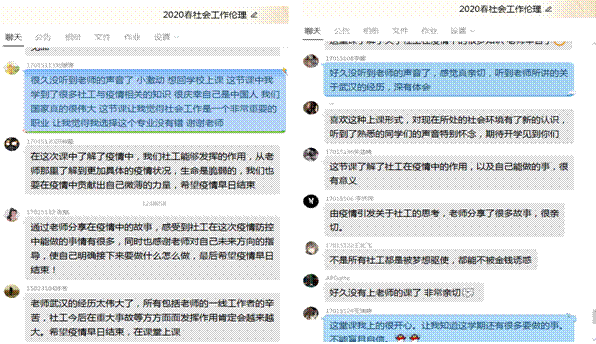 疫情教会我们的那些事。这次的疫情,对教育事业来说是一场巨大的挑战,挑战不在于我们是不是利用线上平台授课。而是我们的青年是否得到了反思,得到了成长。疫情总会过去,但在这段时间里,青年大学生应该思考些什么。黄莹老师在第一节伦理课的最后,设计的这样一个讨论的环节,疫情到底教会了我们什么?作为青年的一代,在国家遇到危难的时候你有没有参与其中,奉献自己的力量?“青年兴则国家兴,青年强则国家强。青年一代有理想、有本领、有担当,国家就有前途,民族就有希望。中国梦是历史的、现实的,也是未来的;是我们这一代的,更是青年一代的。”在对抗疫情的过程中,社工系的同学也加入了社区一线的服务队伍中,黄莹老师用他们的例子鼓舞大家,做有为青年。