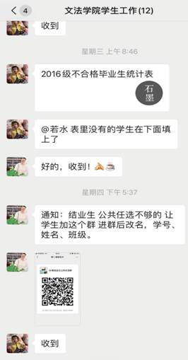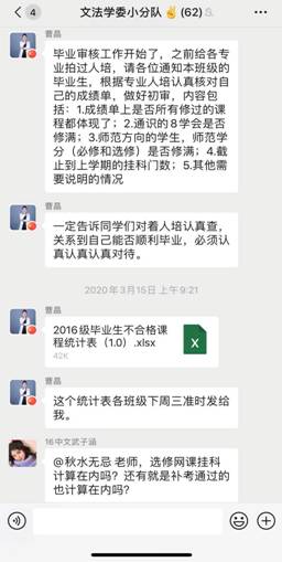 在疫情防控的特殊时期,对2020届本科生的毕业审核工作也“上线”了。为督促2020届毕业生了解本人学业完成情况,及时重修所缺必修课程和补全所缺选修学分,保证本学期能顺利毕业,学校教务处根据工作安排开展了第一轮毕业学业预审核工作。接到教务处通知后,学院高度重视,第一时间成立毕业资格审核小组并部署相关工作。本次审核主要对2016级毕业生的不合格课程进行统计,教学秘书老师对学生回传的数据仔细核对,确保信息准确全面,随后将学校关于2016级预毕业生不合格课程重修和考试安排通知发至学生群,并督促学生及时关注毕业审核的通知。在辅导员老师和学生的积极配合下,第一轮毕业生学业预审工作顺利完成。