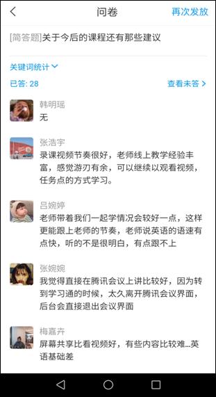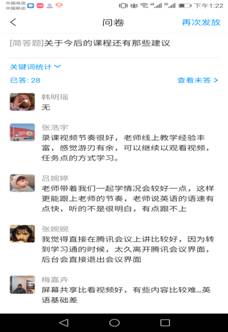 学院线上课堂教学井然有序,教师主动负责,克服网络故障、教学环境、信息技术等多种问题,多途径发布课堂公告,分享课外阅读材料,及时互动答疑,得到学生一致好评;各教学班到课率好,大部分学生遵守纪律,学习积极性高,主动参与课堂讨论,提出学习问题,按时完成作业任务,逐步进入线上学习状态。
