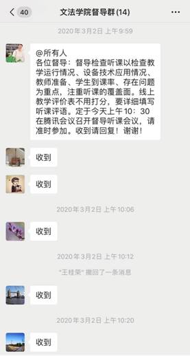 为提高线上教学质量,学院在工作群里以接龙的方式统计每日授课情况,内容包括学生出勤、教学资源、教学活动、存在问题、所需支持等。从汇总的线上教学日报表可以看出,开学第一周学院教学秩序井然。面对线上教学高峰时段网络拥堵的现象,教师们灵活应对,积极启动备用方案;学生出勤率高;对于老师和学生提出的问题,学院积极解答并给予解决措施。