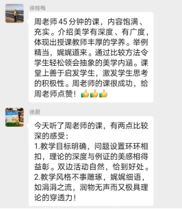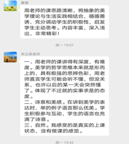周凤莉老师本节课的授课内容是美学的研究方法,她先是强调了马工程教材中所指的美学研究方法不是具体的研究方法,而是指美学研究思维。围绕这一问题,她进行了深入的讲解,在讲课过程中,周老师能够在尊重学科特性的基础上充分考虑到学生的接受程度,将抽象的理论具象化,讲课风格平实、质朴,努力将个人的学识和思考转化为授课内容,力求学生课堂受益最大化。 听课结束后,各位听课教师纷纷对周凤莉老师的授课情况进行了点评,涉及到授课内容、授课风格、学生听课效果等各个方面,老师们一致认为:周老师的授课风格平实、质朴;授课内容层次分明、逻辑严谨;互动话题设置得合理巧妙,学生参与度较高。同时,老师们也善意地指出了其不足处,并给出了宝贵的建议。听课老师的点评专业、精准,不仅有高度,更有热度,周老师表示受益匪浅,将牢记同事们的箴言惠语,将其作为前进的动力和财富。至此,该项教研活动被推向了高潮。