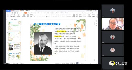 社会工作专业的汲新波老师作为第二位主讲人以三脑理论在教学中的应用为题,向我们讲述了她作为咨询师的经验如何在教学中得以延伸。首先,汲新波老师具体介绍了三脑理论。三脑理论是有美国学者麦克莱恩所提出的,他认为人脑结构大致可分为三层:最下层为爬行脑(本能),负责人体本能的自身运转。中间层为情绪脑(情绪)控制人的记忆。最上层为皮质脑(认知),控制思维、认知、语言等高级功能。三脑互相协同,指导人做出各种行为。在情绪脑极为活跃时,认知脑的活动会相应减弱,因此需要格外注意二者的平衡。