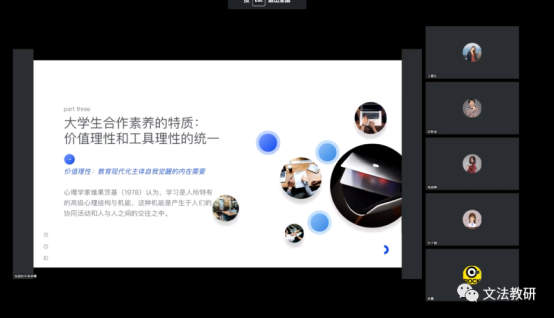 最后一位主讲人是来自网络与新媒体专业的张颖老师。张颖老师本次的分享内容是在自己之前的教育规划与教改课题的基础上,针对合作素养与教学实践创新这一主题进行的研讨。她强调,合作素养以不同的形式出现,贯穿教育教学与人才培养始终。因此,厘清大学生合作素养的概念、意义与路径有着极为重要的意义。