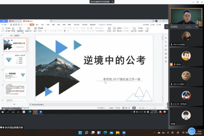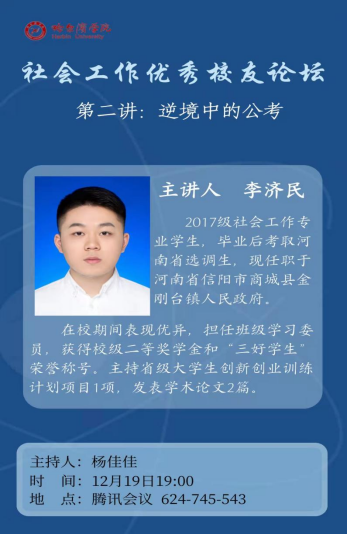 12月19日晚7时,社会工作优秀校友论坛邀请我校2021届毕业生、河南省金刚台镇选调生李济民带来第二讲,社会工作专业教师杨佳佳主持。李济民同学在校期间表现优异,曾担任班级学习委员,荣获校级二等奖学金和“三好学生”荣誉称号,主持大学生创新创业训练计划项目1项。