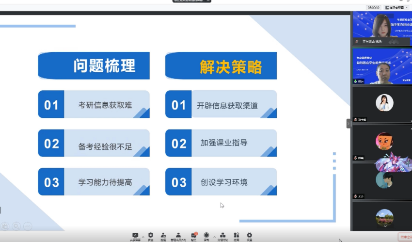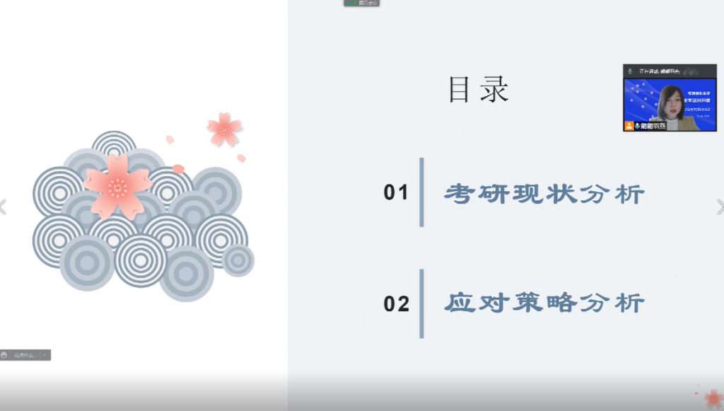 在专业教师分享之后,教学院长周晓燕副教授对于2022年全国的考研现状及学院的具体情况做了分析与评价。她指出虽然多方面因素的影响下,地方院校应届毕业生成功考研门槛提高了,但报考比率居高不下的现状要求办学主体必须高度重视学生的考研辅导工作。她建议从职业生涯规划、专业能力培养、人才培养方案调整、专业课程(群)支持等方面建成立体多元的助力体系,不但关注理论知识教学帮助学生顺利通过初试,而且关注专业能力养成,助力学生终身发展。