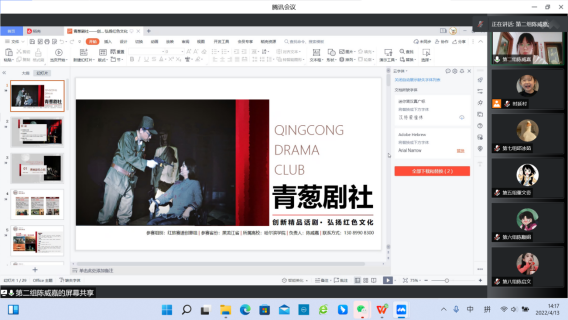 初赛共分为三个环节举行。首先,每个团队结合PPT进行现场风采展示,限时五分钟。各组选手分别从项目概述、市场前景、营销策略、财务预算、盈利模式等方面对项目进行分析阐述。其中,第二组陈威嘉团队参赛项目《青葱剧社——创新精品话剧·弘扬红色文化》以其体现的红色精神、历史文化等从众多项目中脱颖而出,该项目针对当前文化市场的痛点及实时政策,依托文法学院强大的原创能力和深厚的历史积淀,致力于优秀精品红色话剧打造,是新文科背景下大学生创新创业的优质成果。第十组李晓慧团队参赛项目《伦暮千岁树》则是通过与政府、社区合作协同发力为老年群体提供优质高效、便捷普惠的社会服务吸引评委眼球。此次选手们的精彩展示,充分体现了我院创业青年昂扬向上的精神风貌。