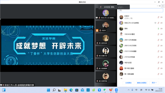 为激发大学生创业活力,增强专业人才储备,展现我院新时代“三创”教育成果,文法学院于4月13日下午14:00通过腾讯会议在线上举办了“丁香杯”大学生创新创业大赛初赛。本次比赛共计10组参赛团队,大学生创新创业中心副主任郭林,指导教师李健、宋宇,文法学院学工办主任李轶琦,辅导员吴世翀、宫鹤桐、董超颖担任评委。