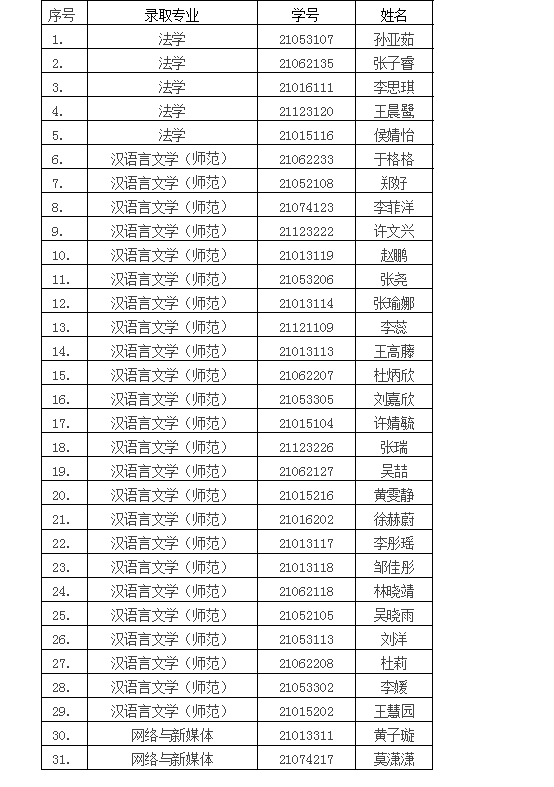 根据教务处公布的最新消息,孙亚茹等5名同学、于格格等24名同学、黄子璇等2名同学分别被法学专业、汉语言文学专业、网络与新媒体专业录取,另有10名同学降转免试进入以上三个专业学习。学院申请转专业的46名同学中,有16名通过考核被新专业录取,7名转入非考核专业学习,其余23名同学继续留在原专业学习。学院将竭力做好转入同学的课程安排与专业适应工作,对转专业未果的同学也将持续跟踪帮扶,不断提高学生专业能力,提升专业情感。