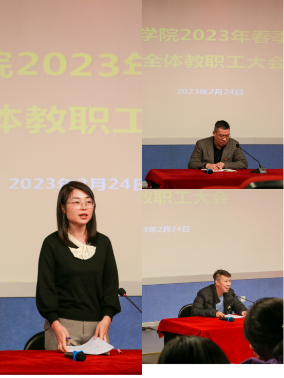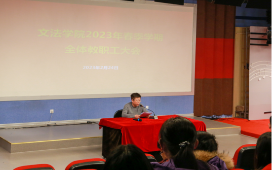 为进一步凝聚力量,谋划新篇,确保各项工作有序开展,2月22日,文法学院在1401召开2023年春季学期教职工大会,文法学院党政领导班子成员及全体教职工参加了会议。会议由学院党委书记杜真强主持。会议就2022年工作进行了全面复盘总结,对2023年春季学期各项工作进行落实部署。