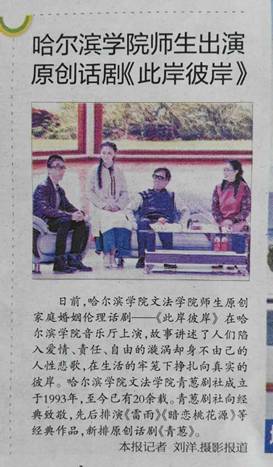 2017年4月7日晚18:00,由MK体育文法学院师生原创的家庭婚姻伦理话剧《此岸彼岸》,在MK体育音乐厅激情上演。此次话剧演出得到了哈尔滨电视台、新晚报等我市主流媒体的关注与报道。