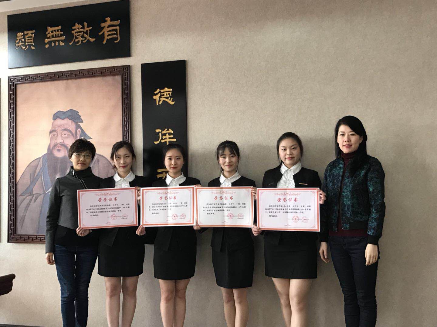 2018年4月20日至4月22日,2018年全国高校秘书专业知识技能大赛在江苏师范大学举行。全国各地17个省份46所高校共68支队伍,参赛选手272名,领队及指导教师137人参赛。我校文法学院15级秘书学专业的田思祎、王君宇、高歌、于爽四名同学在李玉梅、常淑云两位老师的带领下代表学校参加了此次比赛。我校秘书学专业师生凭借着扎实的专业技能,收获“团体一等奖”等四项团体奖、五项个人奖。
