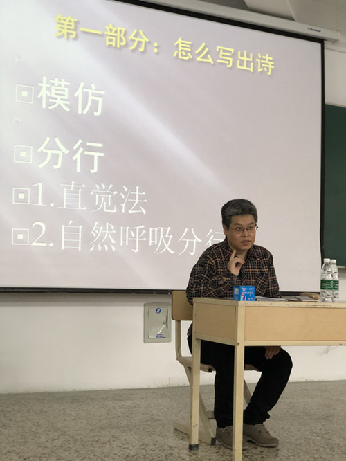 讲座伊始桑克老师首先做了个关于有多少同学写过诗歌,又有多少同学从未写过诗歌的现场小调查,现场掀起一阵小高潮,这个调查既引起同学们的思考,又吊足了大家对于诗歌创作的胃口。讲座主要分为三个部分,第一部分主要向大家介绍诗歌创作的原始方法就是从模仿开始。虽然模仿的东西不是原创,但是拙劣的原创不及高明的模仿。我们可以从模仿起步,注意诗歌的节奏。模仿过后要想在诗歌上有所作为,还是应该努力创作自己的东西,写出自己的风格。关于诗歌的内容,他淡到要写你最想说的话,最真实的内心深处的话,表达自己就是最好的内容。同时介绍了诗歌创作的一些技巧,并且以张爱玲的散文《公寓生活记趣》片段为例加以讲解,细致入微,浅显易懂,令大家印象深刻。