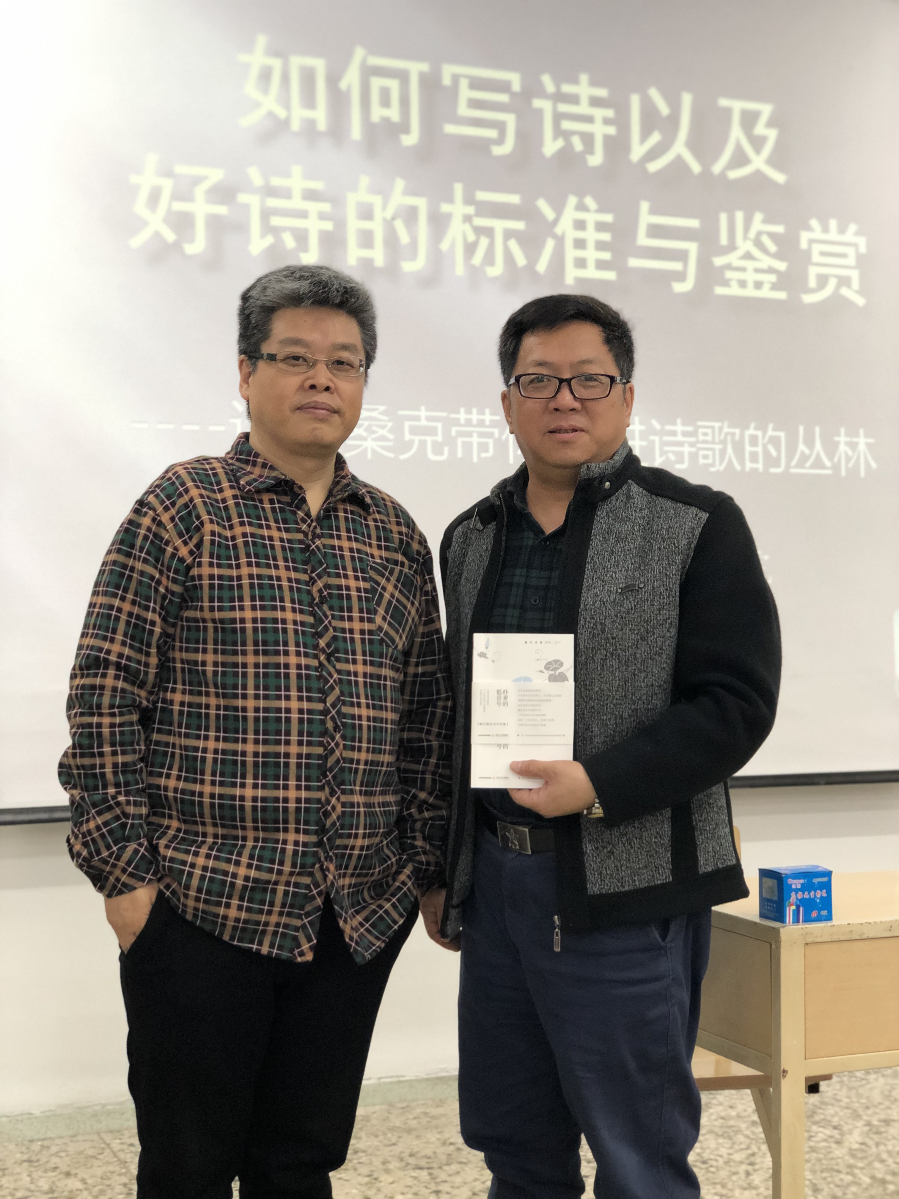讲座过后,文法学院龚宏院长首先代表文法学院对桑克老师的到来表示感谢。并表示桑克老师走进写作课堂为同学们带来了对诗歌创作与鉴赏的深层体会,对于年轻人来说是一个很好的学习机会。龚院长还深情地朗诵了一首桑克老师的新作,赢得了阵阵喝彩。