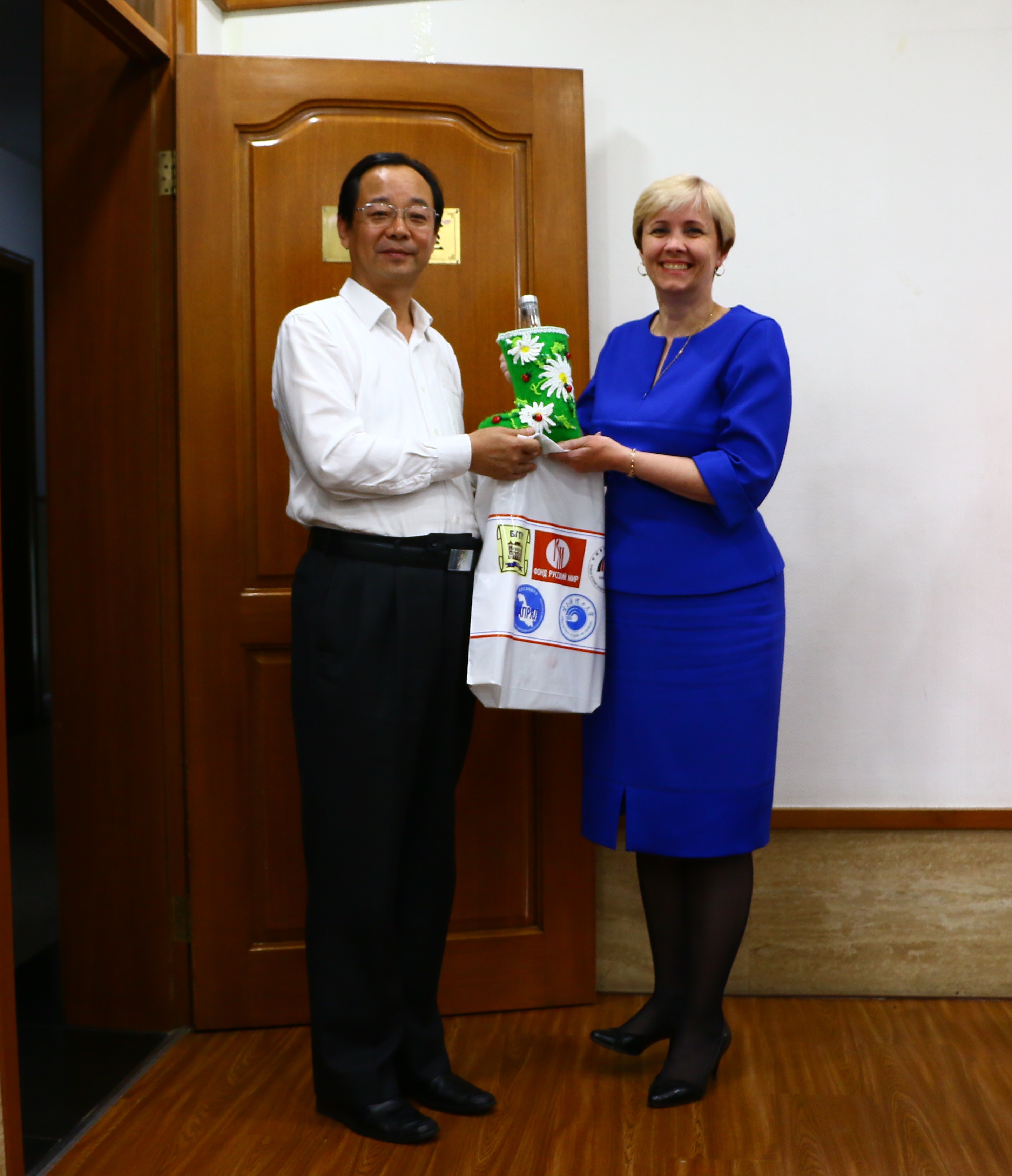 会谈后,校领导与俄方代表团互换礼物并合影留念。
