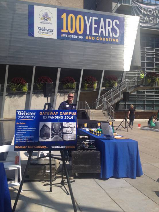 在参加韦伯斯特校庆100周年的当天上午,我和其他几名孔子学院的教师一起按活动手册的时间乘坐了免费通勤车赶往圣路易斯市市中心参加校庆活动。到达之后,我们免费领取了各种关于韦伯斯特大学的宣传介绍材料和小纪念品,观看了乐队演出,和各种卡通造型合影留念。活动没有想象的壮观和庄严,气氛欢快自由。与白天的小型庆祝活动相比,晚上的酒会给我留下了更深刻的印象。酒会在傍晚时分举行,每个参加的人,不论身份,都可以免费领取一件纪念T恤,即使你不是韦伯斯特大学的教工或学生,即使你只是为了免费品尝美食而欣然前往。超过21岁的人,只要出示身份证件还可以领取一只印有韦伯斯特大学100周年校庆的纪念酒杯,并免费品尝所有的美酒。席间,韦伯斯特大学的校长做了简短的讲话。整个酒会高雅时尚,浪漫温馨。美食,美酒和美景至今记忆犹新。